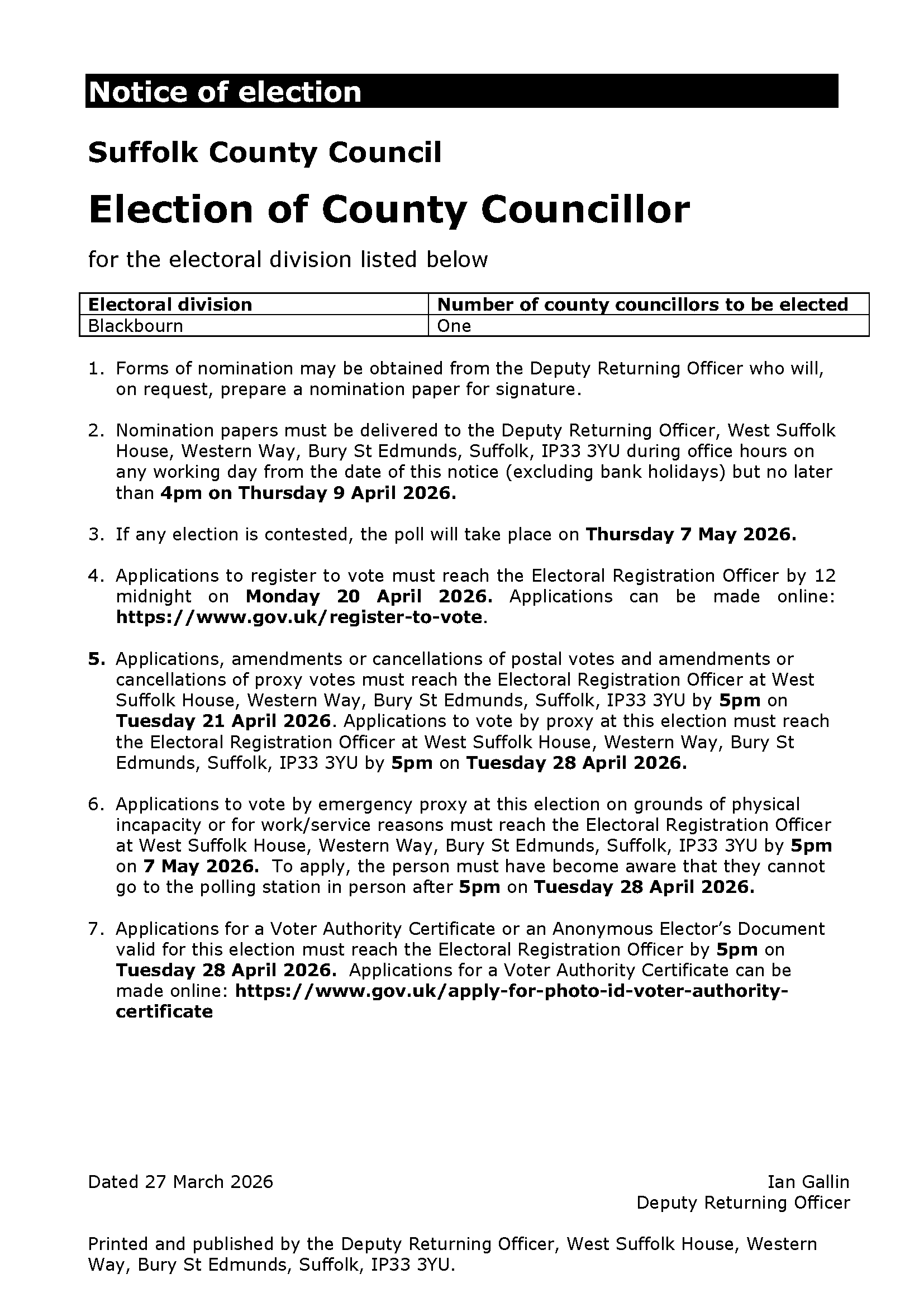 If you wish to find out more about the Suffolk County Council Elections then please refer to our website which sets out the key information and timings of the election, as well as giving information to potential candidates about how to go about submitting their nomination papers to stand for election: Current vacancies and elections (westsuffolk.gov.uk)